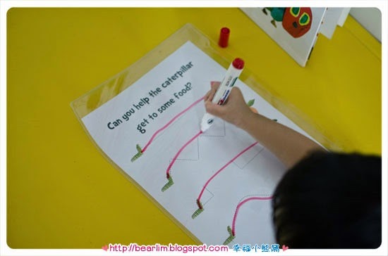 我一边念绘本,一边请Eva喂毛毛虫,matching, 食物名称和数量都间接学习到了 xD