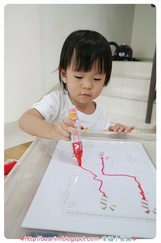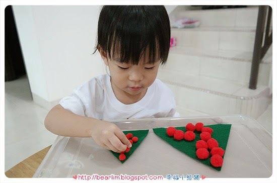 我特地请小妹帮我故意把大粒的pom pom放在小三角形,小粒的pom pom放在大三角形,Eva还会说“不对不对~”然后再把它们放好 xD