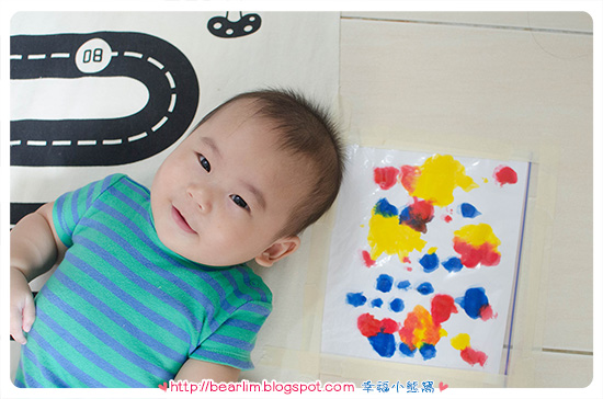 图片显示我是用finger paint的颜料,可是玩到一半的时候发现颜料并没有因为被拍打而散开,所以后来又加了一点tempera paint,所以如果妈妈们想试试看,要用tempera paint比较好噢!